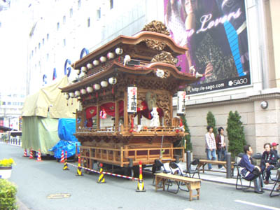 夜の御殿屋台引き回しに向けて、通りに御殿屋台が待機中。