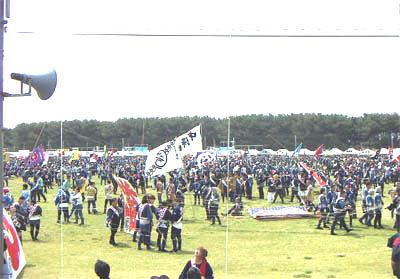 広い会場に所狭しと集まった人々が、ラッパと掛け声で士気を高め、凧を揚げを行う。