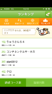 ⑥コース制覇数に応じて順位が付けされ、「ランキング」タブにて、ニックネームと順位が表示される。